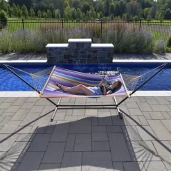 Create a relaxing oasis in your outdoors with this Pillowtop Twill Fabric Hammock from Threshold™. Made from weather-resistant twill fabric, the stripe pillowtop hammock comes with a heavy-duty hanging stand that offers reliable strength to hold up to 500 pounds. Affix this hammock between two trees or out on the back patio and kick back to read a novel, have a drink, take a nap or gaze at the stars.