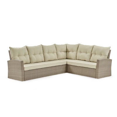 Alaterre Furniture’s Canaan All-Weather Wicker Outdoor Large Corner Sectional Sofa with Cushions offers a fresh, contemporary style will transform your patio or deck into an outdoor oasis. This 5-6 seat corner sofa will make a statement and has plenty of room to kick back and relax. Add the coordinating coffee table to complete the look and you’ll have the perfect spot for your morning coffee. All-Weather Resin Wicker surrounds a 100% aluminum rust-proof, powder coated frame. Weather-resistant Polyester Cushions with tufted seat-backs add to the comfort and style of this collection. Coordinating Cocktail Tables and Stools/Ottoman available with this collection. Recommended to store cushions in a covered location for durability over time