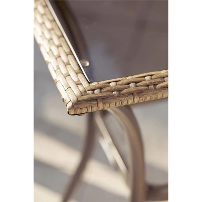 - Outdoor bistro set has a durable powder coated steel frame wrapped in easy to clean resin wicker