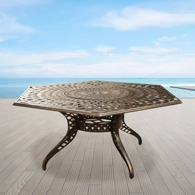 Constructed of cast aluminum in UV resistant, powder coated, hand applied bronze finish, this large hexagon 63 inch outdoor dining table features a top that is designed specifically to prevent damage caused from pooling by allowing water to pass through freely and a lazy susan. Made specifically for large size families or entertaining guests, this mesh lattice modern contemporary hexagonal table with lazy susan is ideal for any patio, porch, deck, balcony and backyard. It is also suitable for indoor or outdoor and commercial or residential use. Aluminum Contemporary Modern Large Hexagon Dining Table Dimensions: 63″ L x 63″ W x 30″ H, 75 lbs. Lazy Susan Dimensions: 24″ Diameter