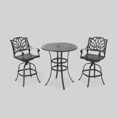 Create an intimate nook for a drink or a cup of coffee in your backyard, patio, or garden with this Christopher Knight Home Alfresco 3 Pc Cast Aluminum Bar Set. Featuring attractive framework, the chairs offer a convenient swivel functional for maximum practicality. All items are created with cast aluminum so they are both durable and easy to move around. This Christopher Knight Home Alfresco 3 Pc Cast Aluminum Bar Set is a great addition to your backyard or patio.