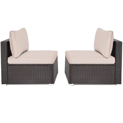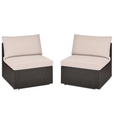 To have a pleasant leisure time outdoors with our wicker armless sofa set. This armless sofa set is stylish and durable thanks to the PE rattan and tough steel frame. Two of them can be used separately or matched with other furniture in your outdoor space. And the ergonomic design can bring you comfort as it highly fit your body radian. With thick and soft seat and back cushion, the sofa set will add more comfort to you. And the detachable design with zipper can bring you convenience for cleaning the cushion easily. Plus, the anti-slip aluminum foot pads ensure the stability of the sofa even in wet weather and can protect the floor from scratching.