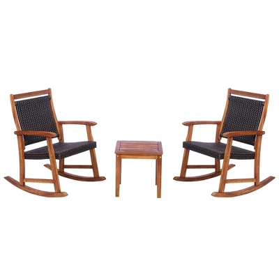 Our rocking chair set creates a comfortable place to enjoy leisure time and brings much pleasure to your outdoor life! Just rock slowly with our chairs and there is nothing better than that moment. Made of premium acacia wood and weather-resistant wicker rattan, this rocker set will serve you for long time. Besides, ergonomic backrest and armrest also add additional comfort to your body. Designed in rustic style, it is perfect to place the rocking chair set in outdoor or outdoor places, such as living room, patio, backyard and garden.