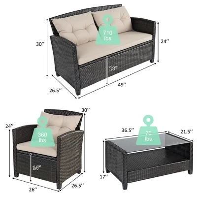- Dimension of the set: package include:2 single sofa,1 loveseat, 1 coffee table, 3 seat cushions and 4 back cushion. Single Sofa: 26” (L) x 24” (W) x 28.5” (H),Loveseat: 49” (L) x 24” (W) x 28.5” (H),Coffee Table: 36” (L) x 21.5” (W) x 17” (H),Cushion: 2.5” (T),Tempered Glass: 0.2” (T),Load-bearing Capacity: Single Sofa: 350LBS,Loveseat: 700LBS,Coffee Table: 110 LBS.