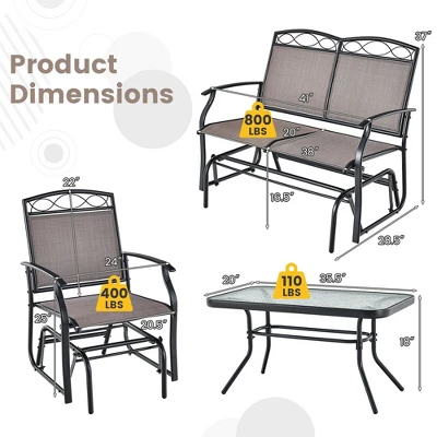 - Free Combination: This 4 piece well-designed glider set consists of 1 loveseat glider, 2 single gliders and 1 coffee table, which can be freely arranged as you need to fit different sizes of places. Dimension of loveseat glider: 41” x 28.5” x 37” (L x W x H). Dimension of single glider: 24” x 28.5” x 37” (L x W x H). Dimension of table: 35.5” x 20” x 18” (L x W x H).