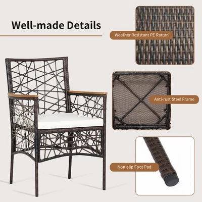 With hollow backrests, acacia wood armrests, soft cushions and wide seats, these patio bistro chairs are ergonomically designed for your upper body. Meanwhile, the all-weather PE rattan and rustproof steel frame make these dining armchairs durable and stable for outdoor use. So you can put them wherever you want, such as patio, backyard, poolside or porch, adding a great addition to your outdoors.