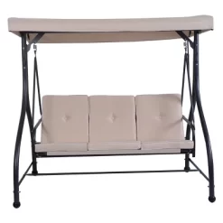 This is our beige 3 seats swing chair. This swing chair can provide 3 people comfortable seats. Made of steel frame, this swing chair is very study and durable. With removable seat and back cushions, you can have a more comfortable seats. Moreover, the back is adjustable turning the swing-bench to a comfortable flat bed that anyone can enjoy. A sun shade canopy can protect you from the ultraviolet ray when in outdoor. This swing chair is perfect for relax, relief, sleep, and entertainment in your porch, patio, garden and pool side. Do not hesitate to buy one!