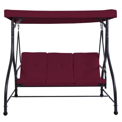 This is our wine red 3 seats swing chair. This swing chair can provide 3 people comfortable seats. Made of steel frame, this swing chair is very sturdy and durable. With removable seat and back cushions, you can have a more comfortable seats. Moreover, the back is adjustable turning the swing-bench to a comfortable flat bed that anyone can enjoy. A sun shade canopy can protect you from the ultraviolet ray when in outdoor. This swing chair is perfect for relax, relief, sleep, and entertainment in your porch, patio, garden and pool side. Do not hesitate to buy one!Assembly Video:https://cdn1.costway.com/Install_video/41089275.mp4