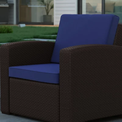 Create an amazing outdoor space with this comfortable and stylish chocolate brown patio chair. The durable resin frame offers a stylish appearance which replicates rattan. Deep seating enhances the comfort level. Beige all-weather cushions will hold up all season long. Clean up spills with a water-based cleaner or the cushions are zipper removable for washing purposes when spot cleaning just isn’t enough. Curl up with your latest read, or just relax and enjoy the outdoors with family and friends and create lasting memories!