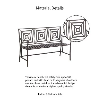 Update your garden decor with this unique garden bench. Constructed from iron, the powder coated bronze finish on this bench keeps from rusting in the elements. The intricate metal back features square cut-outs for a distinct addition to your home. This bench measures approximately 53.54 x 22.63 x 35.82 inches and requires some assembly upon arrival.