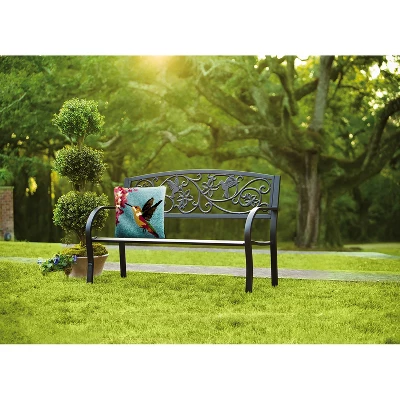With a black finish, this hummingbird bench is an elegant addition to any garden. The bench has a slatted seat, curved arms, and arched back. Crafted from durable cast-iron and steel, the bench is outdoor safe and rust-resistant. 400 lbs. limit.