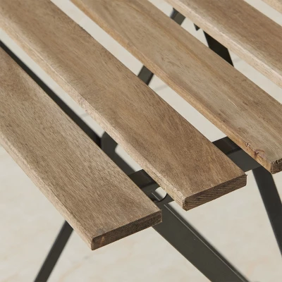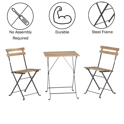 The Folding Bistro Table and Chairs Set by Lavish Home is a stylish way to add additional seating to your porch, terrace, or any outside area. The durable acacia wood and steel construction is built to withstand the elements while the neutral design will pair well with your existing outdoor furniture and décor. This small patio set is durable but lightweight for easy transportation, and conveniently folds for quick storage when it is not in use. This compact combination of a café table with two chairs is the perfect way to optimize small spaces and turn any unused corner of your yard or balcony into an outdoor oasis.