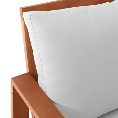 Add style and sophistication to your outdoor living space with this attractive Eucalyptus Wood 4-Piece Set. The set includes a 2-seat bench, 3-seat bench chairs, cocktail table and a coffee table. Frame is made from durable eucalyptus wood that will stand up to varying weather conditions, and the generously padded all-weather cushions will provide luxurious comfort all day long. The neutral wood finish and gray colored cushions will easily match with any accent pieces in your outdoor space creating the perfect outdoor entertainment space!
