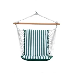 Summer is the perfect time to relax in this comfortable cushioned hanging chair. This chair features Sunbrella fabric, very resistant to ultraviolet rays and color degradation with 1500 hours of fade-resistance. Other elements include hardwood spreader bars, comfortable four inch foam seat and back, chain with s-hook, and mildew-resistant polyester rope cord. Can be hung from ceiling beam, patio, or Algoma c-style hanging frame.