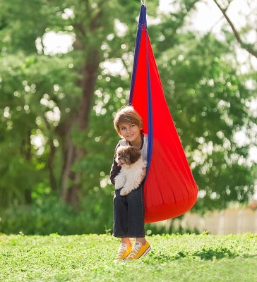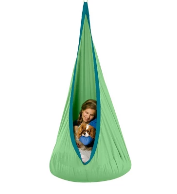 A slightly wider, roomier version of the HugglePod, the HugglePod Deluxe Indoor/Outdoor Canvas Hanging Chair offers extra comfort for older children or just a little extra space for smaller kids to snuggle. It also supports children with special needs by giving them a safe and soothing place to calm overly-stimulated senses. Just like the original, kids can curl up inside the cozy HugglePod Deluxe that’s as warm as a hug and soft as a snuggle. They can tuck themselves inside to have a quiet place all their own to read, take a nap, play with toys, or just enjoy a little personal time for imaginative thinking. The HugglePod Deluxe is made from sturdy cotton canvas with reinforced nylon edging that’s machine washable. It’s perfect for indoor and outdoor use (store it indoors when not in use). It includes a thick, removable, inflatable cushion and a carabiner.