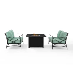 Enjoy an evening by the fire with the Kaplan 3pc Outdoor Conversation Set. Two loveseats accompany the propane-powered fire table providing cozy outdoor seating. Made from sturdy steel, both loveseats have comfortable seat and back cushions covered with solution-dyed polyester. With a slatted top and solid paneled base, the fire table’s simple design blends with a variety of outdoor spaces. The gas controls and a rack for a propane tank are located inside the table’s base, keeping them close at hand but out of sight. Bring family and friends together for outdoor relaxation with the Kaplan 3pc Outdoor Conversation Set.