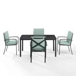 Gather around the Kaplan 5pc Outdoor Dining Set for an elegant meal al fresco. The rectangle table features a slatted design that elevates the sturdy steel construction and creates a perfect partner to the four outdoor dining chairs. Each chair showcases comfy back and seat cushions plus a classic x-back design. The table has a standard umbrella hole that will allow you to add some shade on a hot summer day. Simple and stunning, the Kaplan 5pc Outdoor Dining Set will be a welcome addition to your outdoor entertaining.
