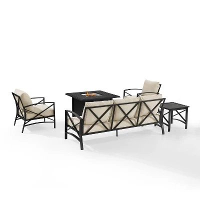 Enjoy an evening by the fire with the Kaplan 5pc Outdoor Sofa Set. A sofa, side table, and two arm chairs surround the propane-powered fire table. Both the sofa and chairs have comfortable seat and back cushions covered with solution-dyed polyester. With a slatted top and solid paneled base, the fire table’s simple design blends with a variety of outdoor spaces. The gas controls and a rack for a propane tank are located inside the table’s base, keeping them close at hand but out of sight. Bring family and friends together for outdoor relaxation with the Kaplan 5pc Outdoor Sofa Set.