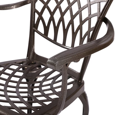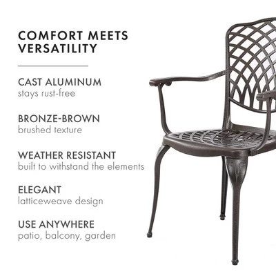 Indulge in an elegant outdoor dining experience with the Kinger Home Arden 2-Piece Outdoor Dining Chair Set. Crafted with a strong cast aluminum frame, this lattice weave-designed patio dining chair set is both stylish and durable. Each dining chair boasts a contoured seat and back for support. Pre-installed adjustable foot levelers were included for stability.