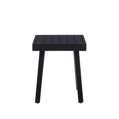 Modern, modest, and reliable, this stylish side table will lend a hand when you need someone to hold your drink or elevate your outdoor decor. Made of aluminum for strength, stability and easy transport, the table weighs less than 10 lbs but can support up to 100 lbs. Moreover, there’s no need to stress about taking it in and out after each use, as the black powder coated finish is rust resistant. A plethora of matching chairs, couches and more are also available for purchase to complete your ideal patio set.Overall Width: 19.75”Overall Depth: 17.25”Overall Height: 20.25”Top Thickness: 2.5”