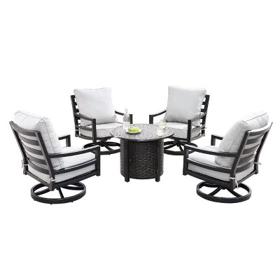 Whether your outdoor retreat is located in the mountains, on the coast, or somewhere in between, this fire table set will extend your evenings with friends and family around the fire. With this addition you can enhance your outdoor setting with even more ambiance and relaxation. This fire table set comes with an Outdoor Aluminum 34 in. Round Fire Table Set with Four Deep Seating Swivel Rocking Chairs, Fire Beads, Lid, Propane Tank Cover and Table Fabric Cover. The dimensions for the fire table are: 34″ L x 34″ W x 24.5″ H, 55 lbs. Each chair dimensions are: 28.3″ L x 33.8″ W x 34.2″ H, 27.3 lbs. The chair seat is 12.6″ H from the seat to the floor.