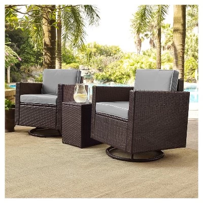 - Includes a patio side table and 2 swivel-rocking wicker chairs for superior seating comfort