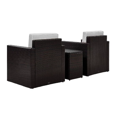 Enjoy the great outdoors in comfort with this 3pc Palm Harbor Outdoor Wicker Conversation Set with Cushions from Crosley. Sturdy and stylish, this all-weather wicker set comes in a warm finish with woven wicker over powder-coated steel frames while clean lines add a cool, contemporary look to your patio decor. Plush cushions with attractive white trim come with a UV- and fade-resistant fabric that ensures your cozy corner on the patio remains inviting all through the year. The handy all-wicker side table completes your space allowing you to rest your steaming hot coffee or snack while you relax in style.
