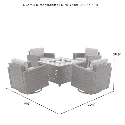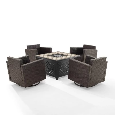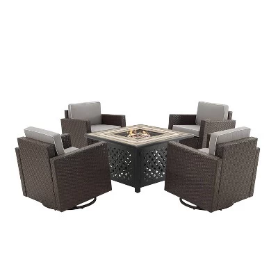Enjoy an evening around the fire with the Palm Harbor 5pc Conversation Set. Each swivel rocker features a durable steel frame covered in all-weather resin wicker, plus a swivel rocking base for easy movement. The fire table has a tiled stone top on a steel lattice base. Both the propane tank and gas controls are housed within the table, keeping them out of sight but close at hand. Cozy up with family and friends with the Palm Harbor conversation set.