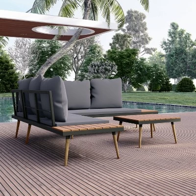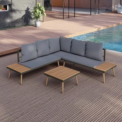 Whatever you envision for your outdoor space, make it happen with furniture you love. This sectional sofa is beautiful, comfortable and has two integrated side tables and a coffee table to create the outdoor space of your dreams. The frame is made of aluminum and FSC acacia wood on the tables and legs, So you can relax by knowing it’s built to last for years to come. The patio set offers a seating capacity for 5 people and all cushions and pillows are included.
