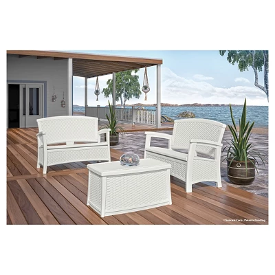 Combining extra seating with extra storage space, the Suncast ELEMENTS™ Resin Patio Storage Loveseat is an ideal addition to outdoor patio furniture sets. Constructed from durable, all weather resin for strength and stability, the extra large seat easily seats two with room to get comfortable. With an ergonomically designed back and contoured curves for added lumbar support and an air cushion back that conforms to your body, this isn’t your standard patio furniture. Unique, convenient storage beneath the seat adds another unexpected twist, making the Suncast ELEMENTS™ Resin Patio Storage Loveseat a great option for keeping your patio organized with space for cushions, covers, and other patio accessories. And with a stylish, contemporary wicker design that completes the Suncast ELEMENTS™ Resin Patio Furniture with Storage Collection, it’s perfect for any patio.