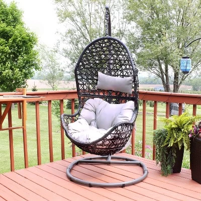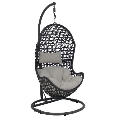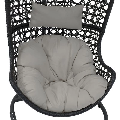 Great for patios, porches or lawns, this hanging egg chair is a chic seat that is sure to complement your indoor or outdoor aesthetic effortlessly. Durably constructed to be weather resistant, this chair features a steel frame wrapped in resin wicker, polyethylene rattan. No need to worry about splinters or slivers, as this material stays smooth to the touch unlike traditional, natural rattan. The cushion and headrest are easy to keep clean and are designed to withstand mild or harsh weather conditions like rain, wind, and sun. The simple 2-piece assembly and included hardware makes it easier to put this chair together. Plus, this set includes a durable steel stand with an attractive, powder-coated finish that resists rusting for greater longevity. This stand and chair can be set up in any outdoor living space for a trendy seating option that everyone will love!