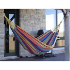 This two person yellow and purple striped hammock is the perfect way to relax in style in your own backyard today! Read a book, take a nap or have a drink while swaying in the warm breeze this summer with this hammock. This hammock is perfect for hanging between trees, on your balcony or in a hammock stand. Order your hammock today to relax under the warm sun with the people you love this summer!Features:Yellow and purple striped two person Brazilian hammockThe bed length is 94”This hammock can hold 2 peopleCan be used indoors or outdoors Weight capacity: 450 lbsDimensions: 144 inches long by 63 inches wideMaterial(s): cottonNote: Stand and hanging hardware are not included