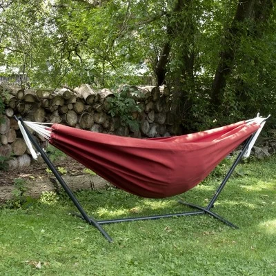 The Double Sunbrella Hammock and Stand Combo is our top choice to challenge the elements. The double hammock is made with Sunbrella fabric to outlast every season, year after year. It is as comfortable as cotton, creating the perfect refuge for an afternoon snuggle. The stand is constructed of heavy duty steel and assembles in minutes without any tools. The zinc coated legs prevent rust and plastic caps top the ends of the steel tubing to create a soft finish. The stand provides you the freedom to setup your hammock in the most convenient location and the premium carry bag included makes it easier than ever to travel with your new hammock and stand. Exclusive Features include Sunbrella Fabric reflects UV rays, resists fading, staining, and mildew and can be kept out all year long. Superior Polyester end strings ensure a durable long lasting hammock. Life is better in a Vivere Hammock. Relax the World with Trusted superior quality.