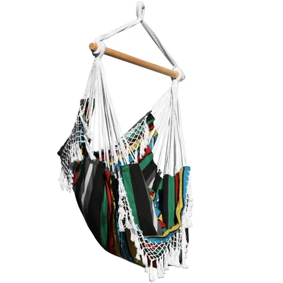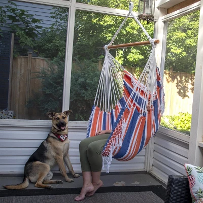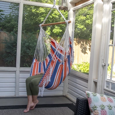This Brazilian Hammock Chair is constructed of tightly woven 100% cotton, making this the most relaxing chair you will own. Now available in ten specially-selected color combinations with a coordinating, hand-crocheted fringe on both ends that adds a Bohemian touch to any space. Once set up, there’s additional fabric that stretches up behind you, providing you with the perfect place to rest your back. The hammock chair can be used both indoors and outdoors due to its small footprint and arrives with the wooden spreader-bar and additional sling. The hooks and springs are sold separately.