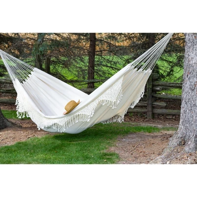 This Double Deluxe Brazilian Style Hammock has understated elegance. This hammock is complimented by a detailed hand crocheted fringe down each side that would make anyone feel like royalty. An excellent addition to any backyard, cabin or campsite.