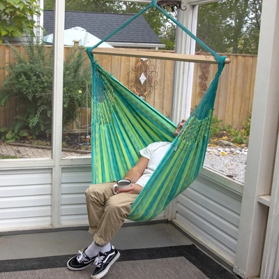 Vivere’s Latin hammock chair collection is constructed of tightly woven cotton, a strong and durable wood spreader bar, and a cotton rope hanging sling. The ultra wide seat is the ideal spot to hide for an afternoon nap, or to sit up and enjoy the activities happening around you. Choose one of the eye catching color options to elevate the aesthetic of any backyard space. Hanging hooks and springs sold separately.